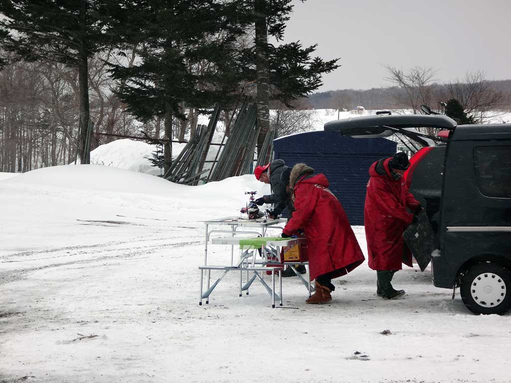 急に雪が降ってきて、一同撤収モードに突入!